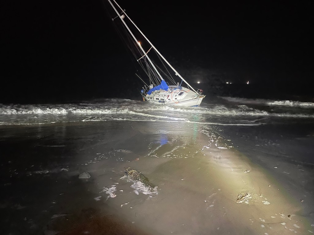 Later that same evening, around 10 p.m., crews responded again to the beach after a kayaker — possibly associated with the beached boat — became exhausted while attempting to tow the vessel back to sea. He eventually reached another boat about 150 yards offshore. A rescue swimmer confirmed he did not need further assistance.