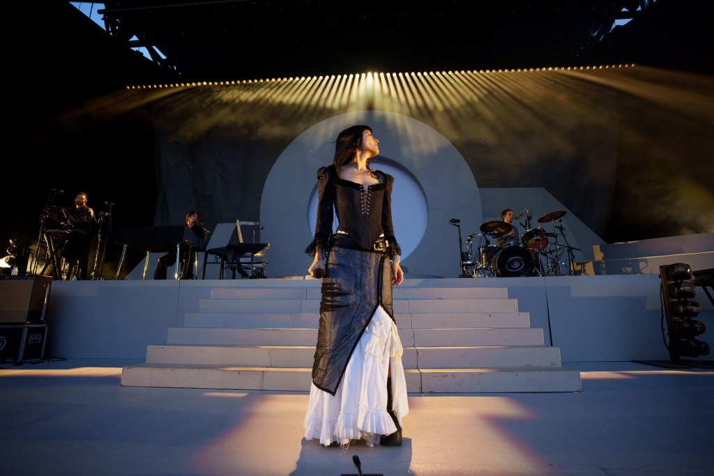 Zardoya began the night, only visible as a silhouette, singing “Hamptons” from behind an opaque grey ring, which was one part of the band’s stage structure that vaguely resembled a submarine. As she surfaced from behind a screen, The Marías submerged fans into their catalog of genre-fusing songs from albums such as Submarine; CINEMA; Superclean Vol 1.; and Superclean Vol 2.