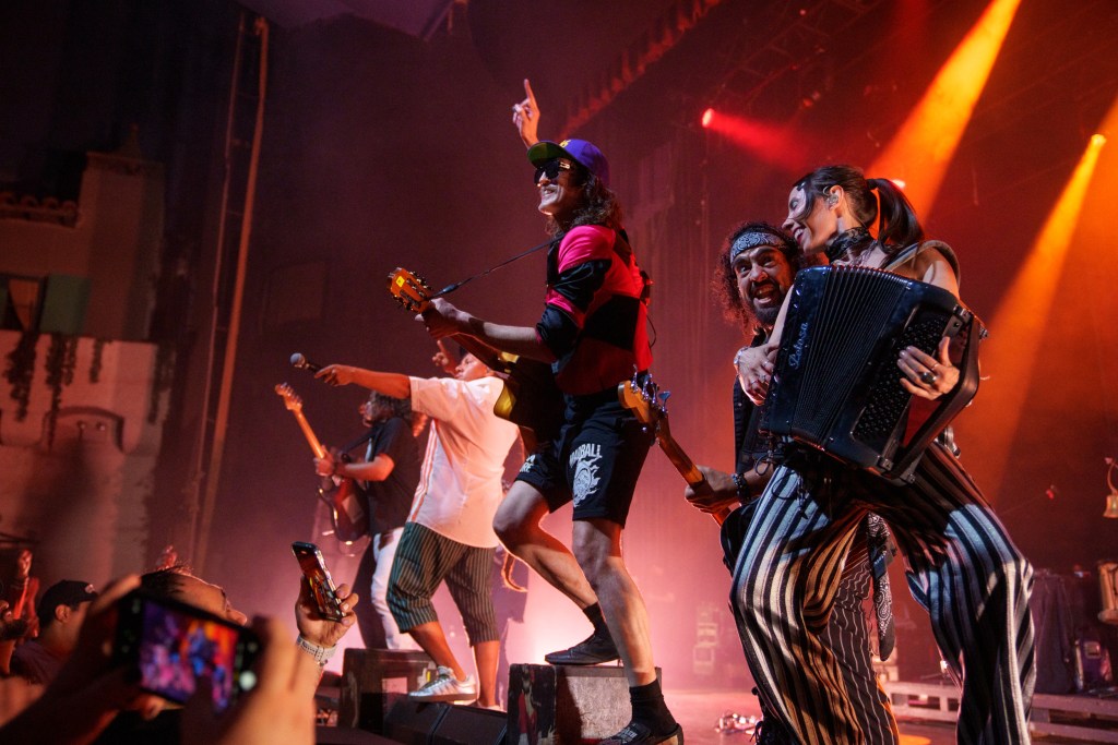 Gogol Bordello played songs from their entire discography with an emphasis on their latest album, Solidaritine (2022), all performed with incomparable energy from all band members. Gogol Bordello’s Hütz is a Ukrainian advocate for his people and brings his culture to the forefront in his music. The stage set had a fist symbol background with the Ukrainian flag colors, and their album title, Solidaritine, to share their solidarity with Ukrainians for the Russian invasion of Ukraine.