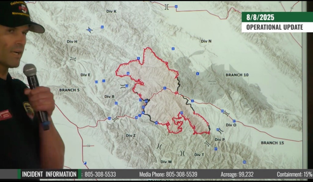Containment of the Gifford Fire crept upward to 15 percent Friday morning, with “more black” on the fire map, said Operations Chief Spencer Andreis with Cal Fire, which is firefighter shorthand to indicate where the fire’s been put down and crews are mopping up. That segment grew along State Route 166, which is where the Gifford broke out on August 1. Hand crews are working hard to build handlines in the San Rafael Wilderness to the south to meet the containment lines established along the east side of the fire. To the west, the Gifford has met the Madre Fire burn scar, left from that 80,977-acre blaze in July. But the total acreage of the Gifford — which quickly became California’s largest fire of the year — grew to 99,232 by Friday morning after the flames blew to the northwest around midnight. By Friday afternoon, the fire had grown to 104,590 acres.