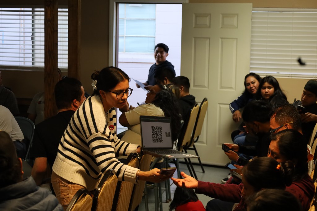 Jenny Alvarez, a former Labor Summer participant who now works as an organizer with the UFW, assists a farmworker during a community meeting. | Credit: UCSB Community Labor Center