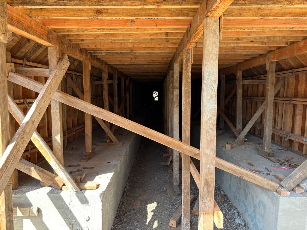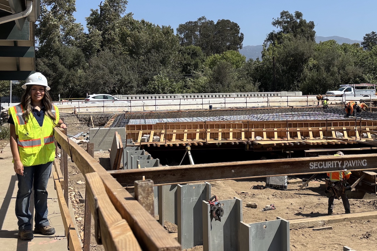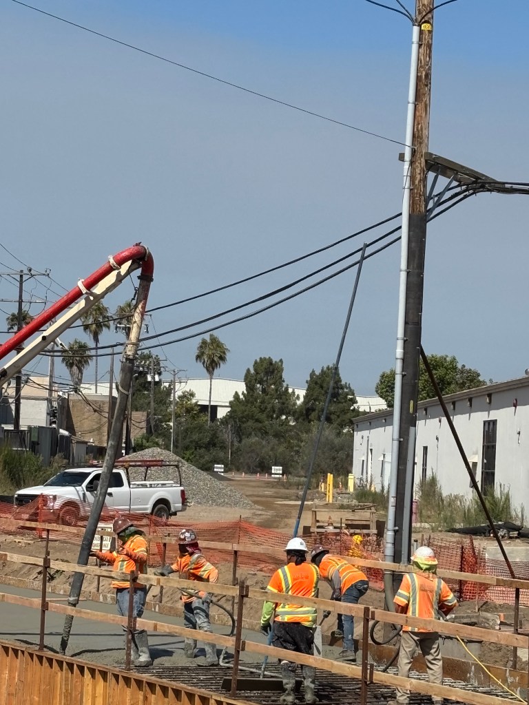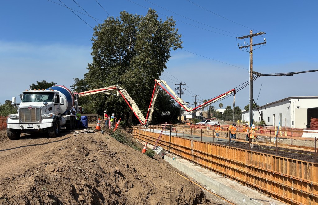 On Tuesday, the trucks were headed for what’s called “a bottomless culvert,” or a dirt-floored horseshoe of cement, as Craig Schellenger described it. He’s the resident engineer for Unico, engineers for the overall project. The culvert will hold up the new street as it crosses Old San Jose Creek, which rarely runs with water, said Schellenger. In the distance beyond the cement being poured, another wide strip of dirt running behind a Yardi Systems building will bring Ekwill Street to Fairview Avenue.