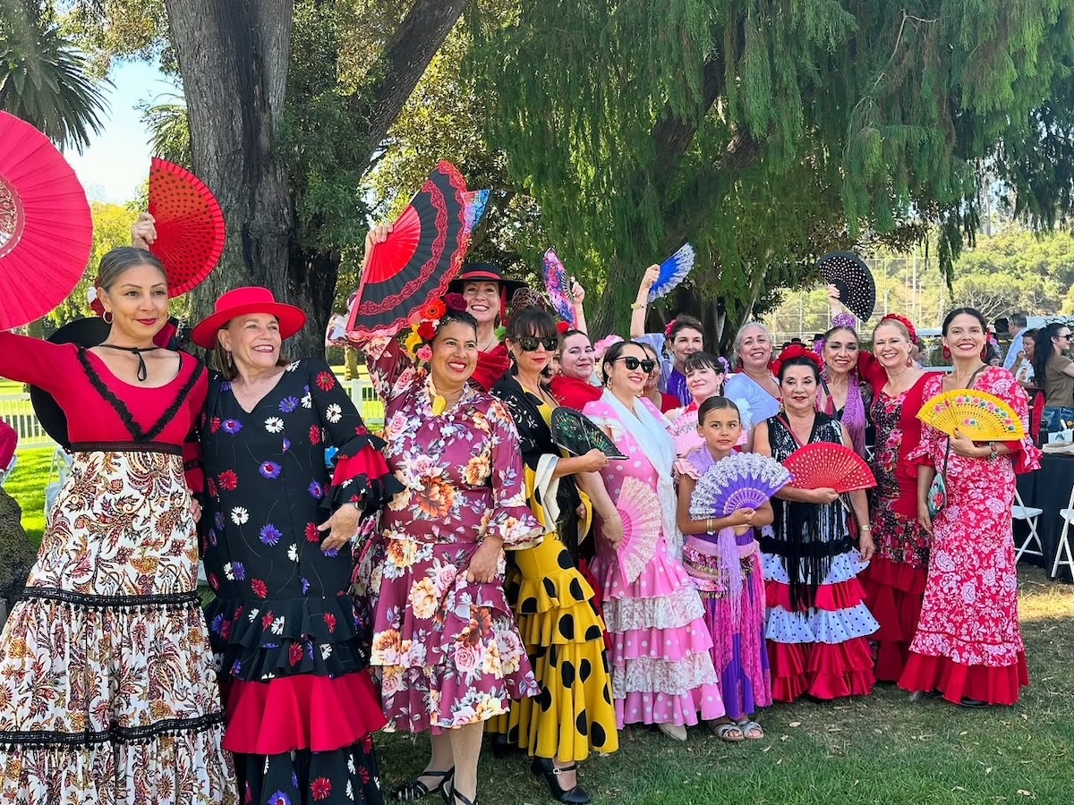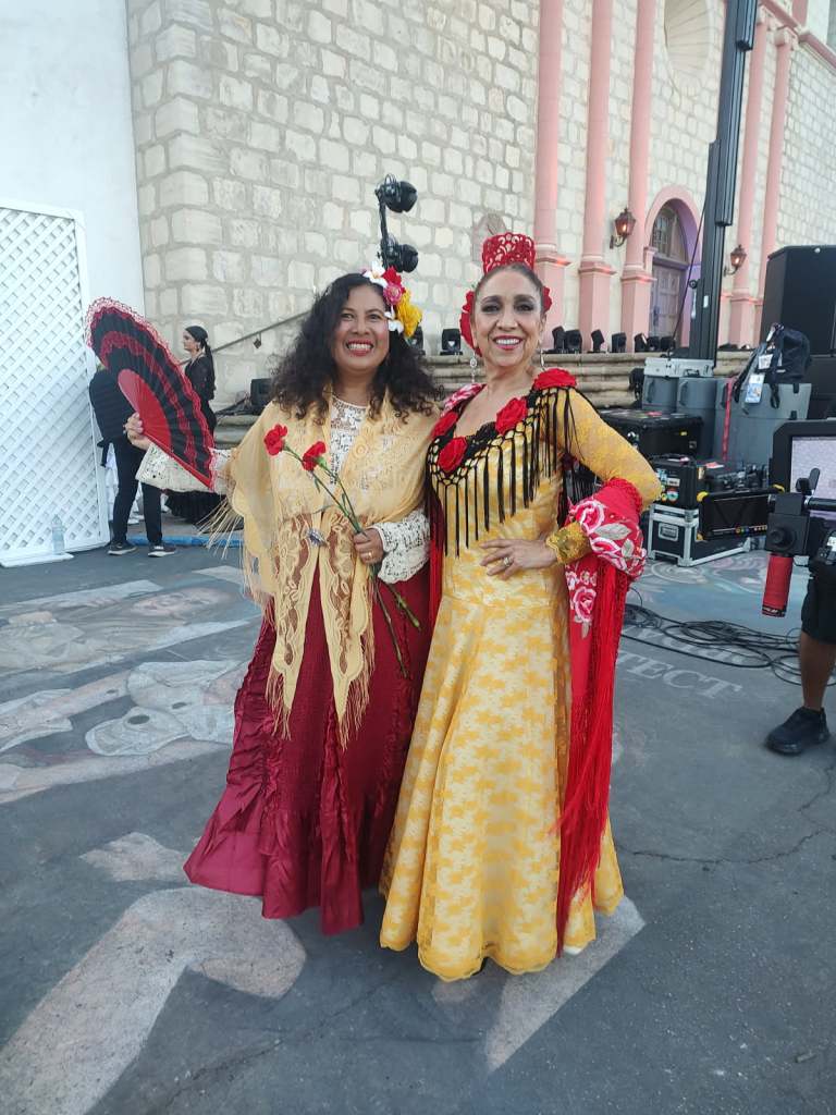 For me, Fiesta began on Tuesday, July 29 with the rehearsal and sound check for the Fiesta Pequeña the next day. Our group, Flor y Canto, sang one song, “La Primavera.” The song was a tribute to the late Erin Graffy. Immediately after the soundcheck, Rosal and I rushed to the Hispanic Chamber of Commerce’s event where Rosal danced a Spanish classical number and her students danced Sevillanas. Our dance set was similar to the one our studio offered at Poetry in Parks at the Alhecama Theatre last April.