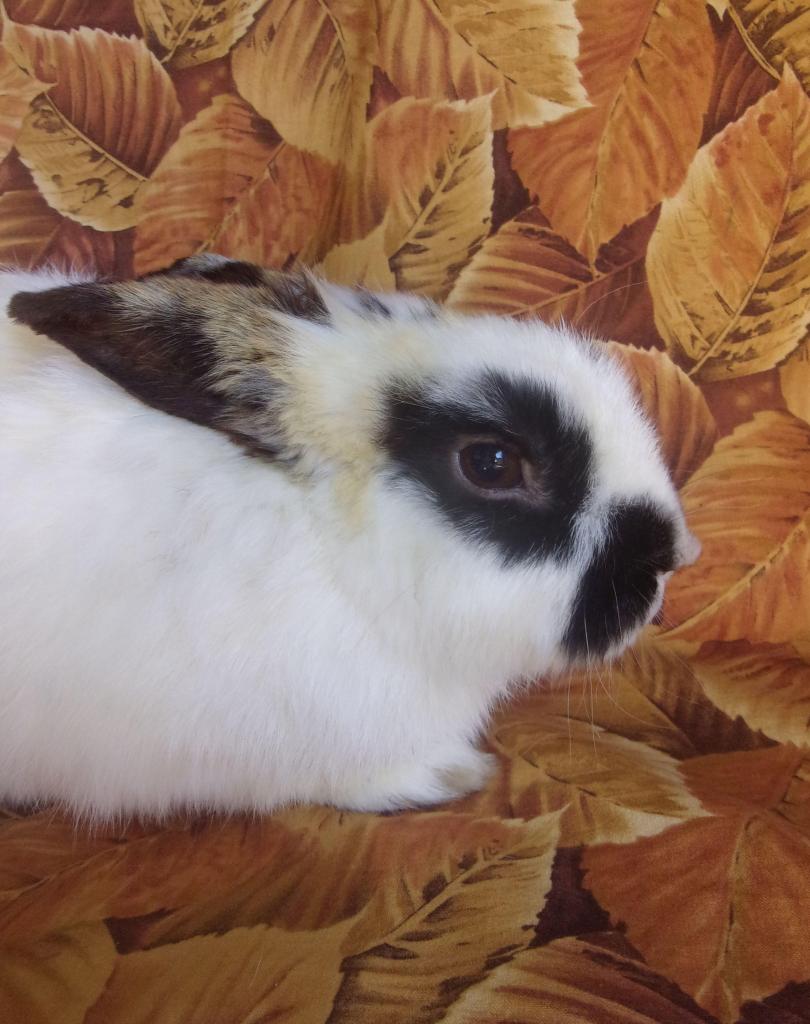 This young male is a mix of hotot and rhinelander and was found as a stray with another rabbit who we named Harley. He may look like a tough biker bun, but Mr. Davison is actually very sweet and easy-going. He absolutely loves to run, explore, and frolic and also loves attention, affection and good things to eat! Come meet him, adopt him and he will return all the love you care to give him!