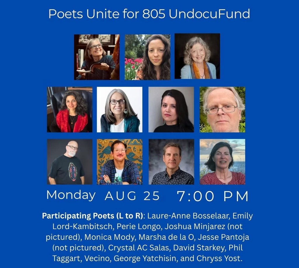 Art meets advocacy and words become action when “Poets Unite for 805 UndocuFund” on Monday, August 25, at 7:00 p.m. at the Community Arts Workshop. This evening of powerful verse and community solidarity brings together six Santa Barbara Poet Laureates alongside gifted established and emerging voices.