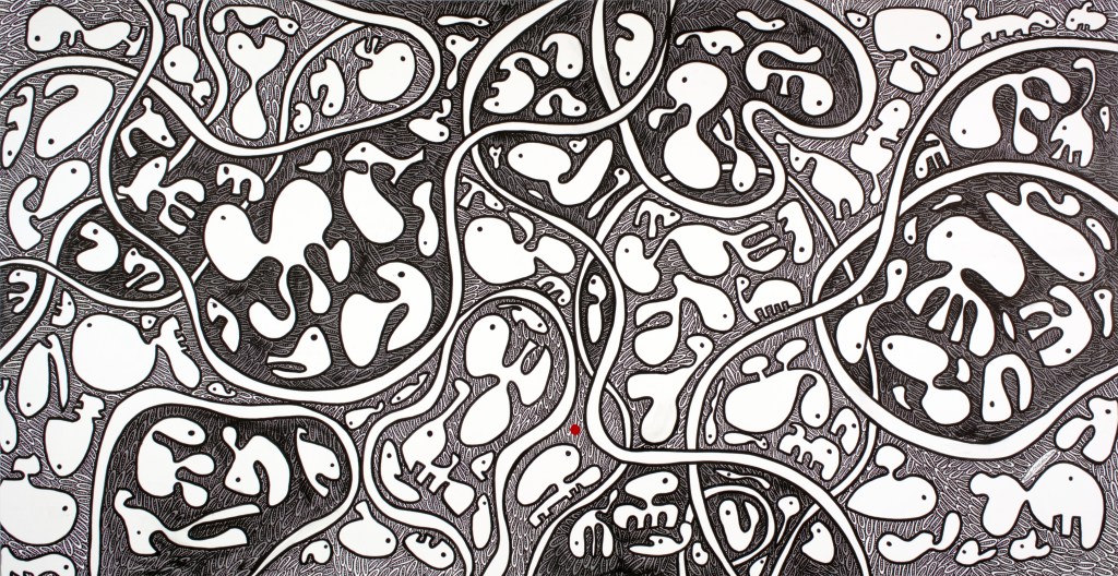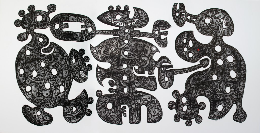 One important distinction is the artist’s palette, intentionally avoiding the profusion of color and tropical decorativeness we are trained to expect from Caribbean culture. The works may be stripped of color, per se (apart from token red dots implying anatomical energy or pilot lights), but they are anything but stark or lifeless. A certain suggestion of animated presence buzzes in the space through painterly gestures and visual rhythms and patterns.