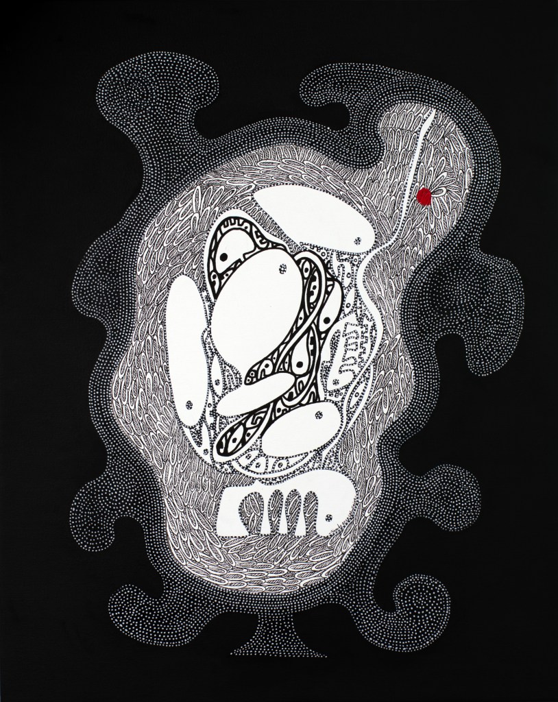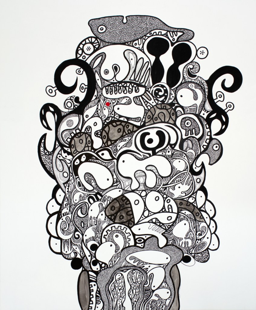 The artist’s black-and-white pieces, sometimes epic in scale, are often explored through variations-on-a-theme series (“Aesthetic Research,” “Gestation,” “Syncretic Object”). They draw into their vocabulary elements of native history and archaeology, references to pre-Colombia, pre-Imperialist life, and a strong, abiding link to contemporary artistic impetuses and imprints.
