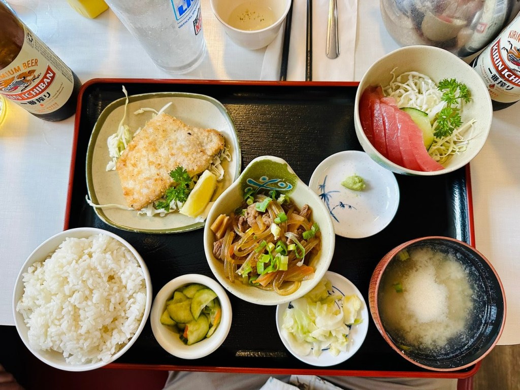 Teshima’s Restaurant: Knowing we needed lunch after landing at the Kona airport, I looked at Eater.com a few minutes before we got on the plane and found a mention of Teshima’s, one of just two Big Island restaurants on the website’s classic restaurant roundup. The staff was immediately welcoming — “howzit?” said the man as we walked in — and the Japanese-via-Hawaiian cuisine was exactly what we needed. Cups of genmaicha tea and plate combos of raw fish, fried fish, miso soup, teriyaki chicken, sukiyaki, tsukemono, and sunomono were finished with fried Oreos for dessert.