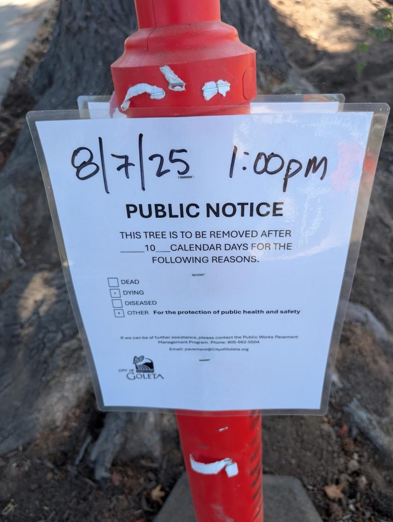 The removal of the trees is part of the City of Goleta’s Pavement Management Program, which aims to maintain and improve its road network by restoring and resurfacing existing pavement to prevent further damage and extend its lifespan.