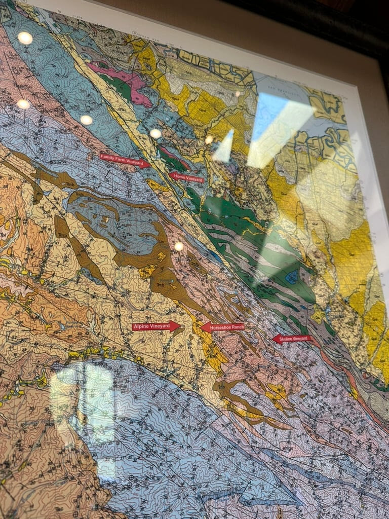 Just east of the fault, the Home Vineyard is on the North American Plate, where the bedrock is decomposed sandstone. Its pinot noir was full of cherry fruit dusted in very powdery tannins that apparently show up every vintage. To the west of the fault, the Family Farm sits on the Pacific Plate, growing in alluvial sand and clay soils. That gives a plummier flavor, enhanced by forest-like, “sous bois” spice.