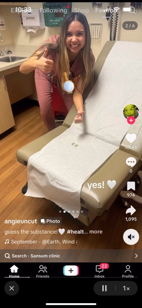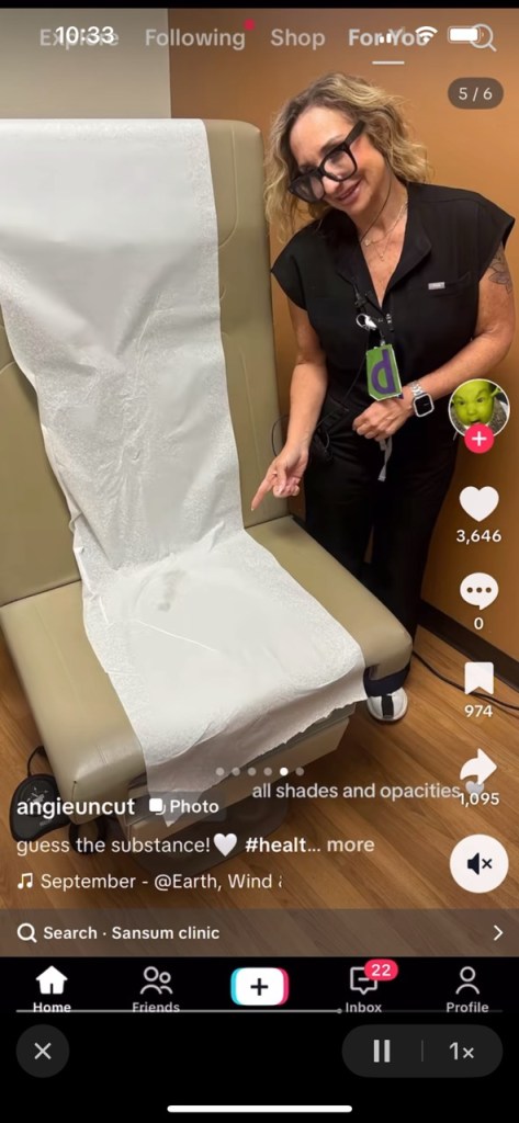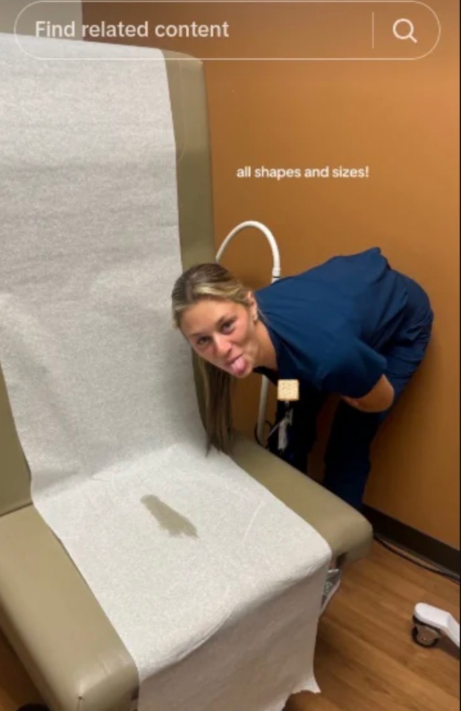 The first image is followed by five more photos of workers standing next to exam chairs stained with unknown bodily fluids. In one image, a nurse in pink scrubs smiles as she holds a thumbs-up sign; another woman in all blue scrubs bends over and sticks her tongue out near a stained exam chair; one blonde woman in thick-rimmed glasses smiles and points at another stain, as the words on the screen say “all shades and opacities.”