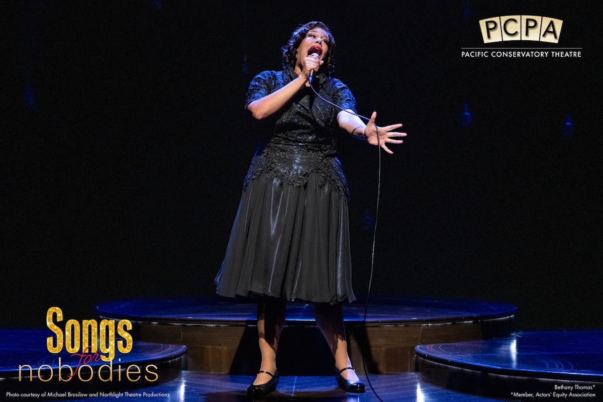 Admittedly, I raised an eyebrow upon learning that PCPA’s summer season finale at Solvang Festival Theater was a one-person show. It’s risky to saddle a single performer with a grand culmination, especially following the big-cast/big-energy extravaganzas of Waitress, Holmes and Watson, and Something Rotten. However, after experiencing the show, I can confidently report that Songs for Nobodies is exquisite, with bring-down-the-house energy — a perfect send-off to summer theater. Impressive singing and acting merge with sleek stagecraft in five storytelling monologues, each about an iconic vocalist, each with musical interludes in the style of the scene’s subject.