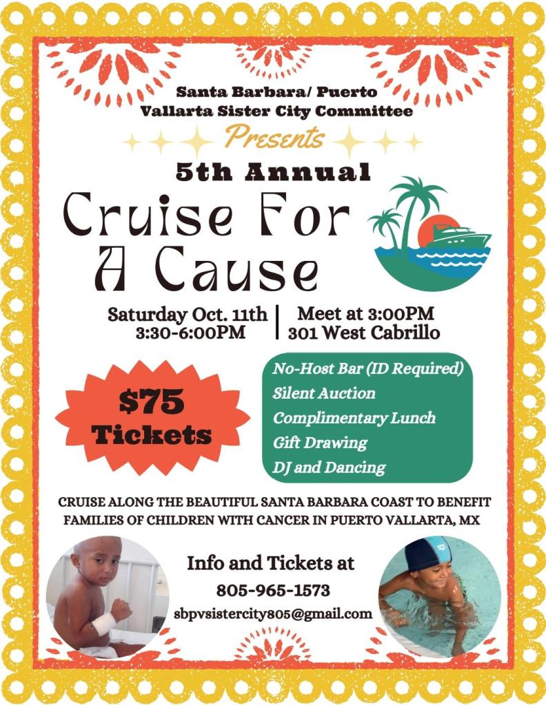 On Saturday, October 11, 3:30 p.m. – 6:00 p.m. City of Santa Barbara Puerto Vallarta Sister Cities Committee will celebrate the 5th Annual Cruise for a Cause to benefit Puerto Vallarta Families of Children with Cancer aboard the Condor Express for a fun and entertaining afternoon cruise along the Santa Barbara coastline.