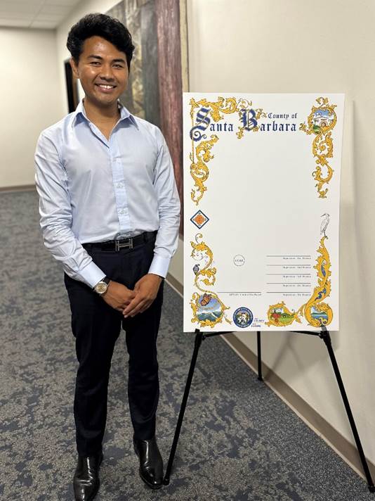 “El Condado de Santa Bárbara es uno de los 27 condados originales de California. Estamos orgullosos de conmemorar este hito con un diseño de un joven artista local que representa tan bellamente a todo el condado”, dijo la presidenta de la Junta de Supervisores, Laura Capps, “Este documento especial será presentado y colgado en hogares y oficinas en todo el condado de personas y organizaciones que tienen un impacto positivo en este lugar especial, desde jubilados que dedicaron décadas al servicio público, hasta organizaciones sin fines de lucro que sirven a las poblaciones más vulnerables del condado”.