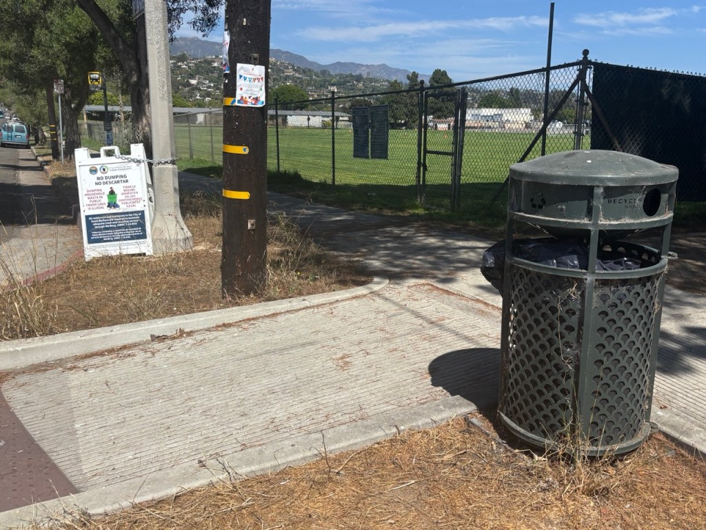 A no-dumping sign has been put up near a frequent dumping spot near a city garbage can on the corner of N Quarantina and E De La Guerra Streets. | Credit: Callie Fausey