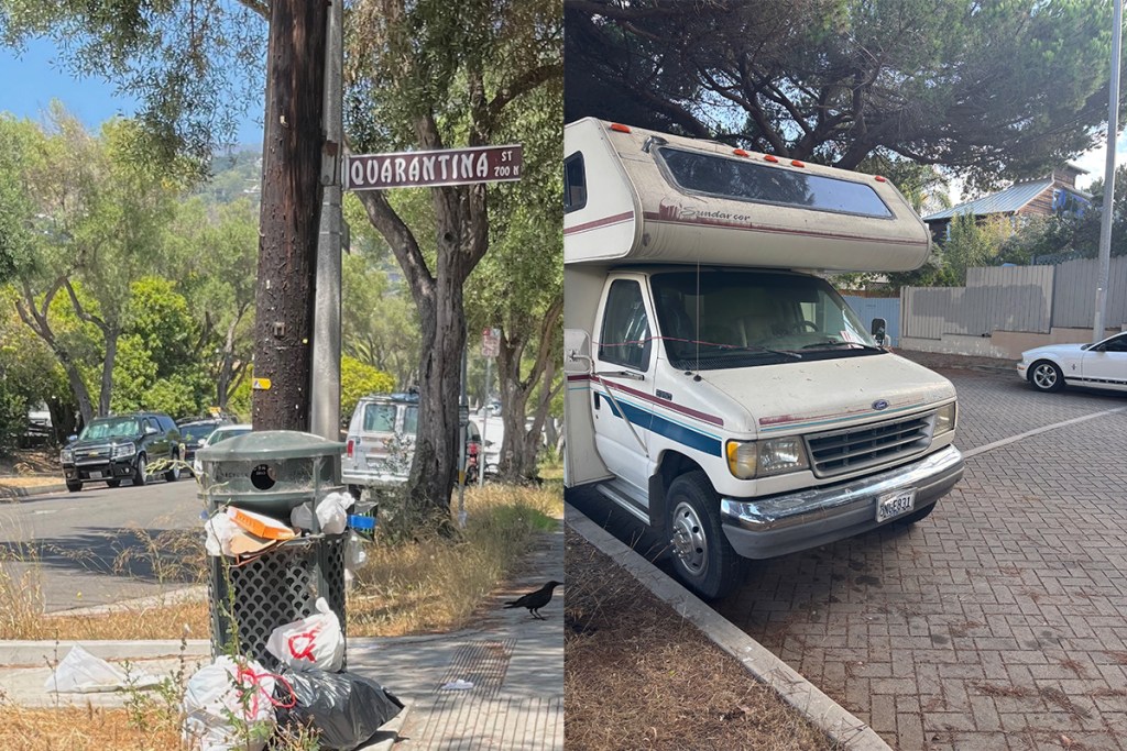 Left: Trash has been left out on the sidewalks around the area near the Junior High and Downtown Club. Right: Many oversized vehicles stay parked on the street longterm and some have received multiple citations, such as the RV pictured here. | Credit: Courtesy
