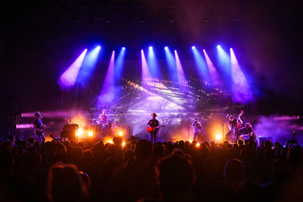 The show was truly one of light and shadow — warm arches of amber stretching above the stage like palm fronds, golden globe lights on the ground pulsing with the drums. At times, the band was silhouetted completely, playing in a fire of low-lying embers.