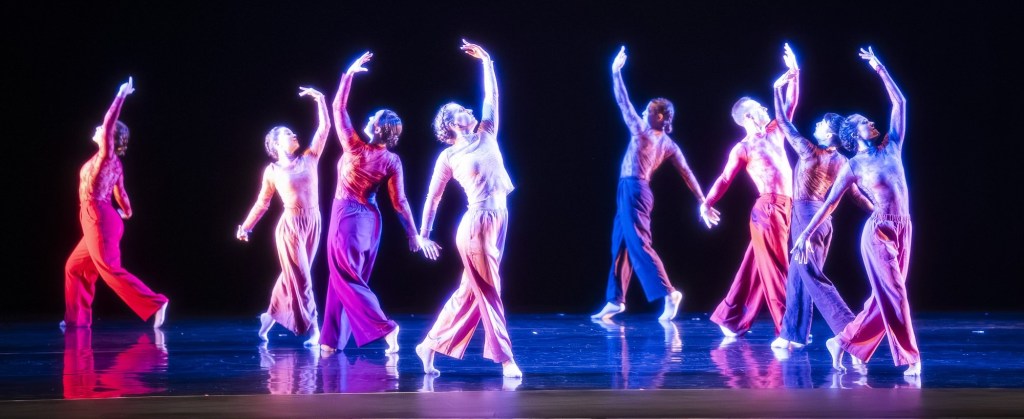 As the second act opened, two huge, white, hinged screens, looking like giant dance hall pillars, dominated the stage. Sometimes they provided a narrow “hallway” through which dancers danced, and sometimes they were moved closer or farther apart by dancers behind them (as evidenced by their feet peeking out from underneath). The spectacular lighting effects colored the whiteness of the pillars in sky-and-sunset colors.