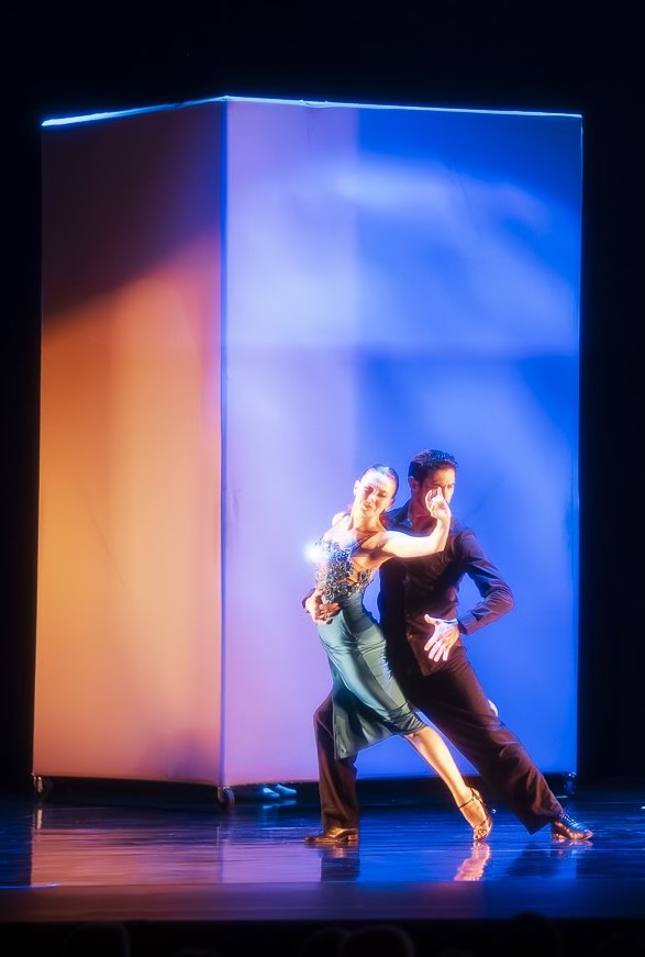 The tango dancers are all international champions, with numerous awards behind their names. Ghi’s partner Silvio Grand, and international champions Zoya Altmark and Martín Almiron were all powerful, sexy, and grounded. Ghi and Grand danced the leading roles, while Altmark and Almiron danced supporting roles, providing a context in which to understand the world of tango. Except for the “red shirt conversation,” the couples danced only with each other, like island universes.