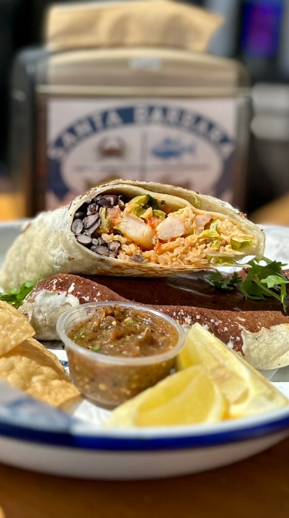 For Burrito Week, the Santa Barbara Fish Market Café created the Baja shrimp burrito, which Chef Paul Osborne stuffs with grilled Mexican white shrimp, nopales, Spanish rice, black beans, romaine, pico de gallo, and a chipotle crema. The kicker is a slather of white Oaxacan cheese on one side of the tortilla that’s then fried to give it a nice crunch.