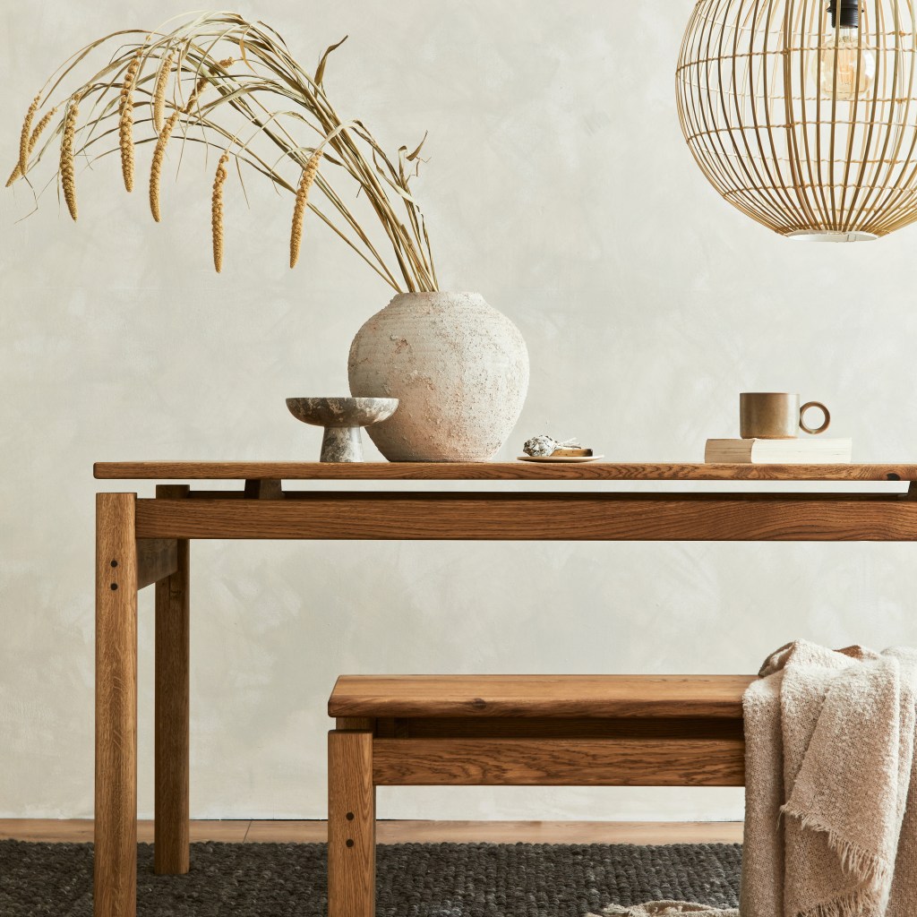 • Incorporate Brutalist-inspired furniture:  Brutalist pieces — like chunky wood tables, carved benches, or oversized stone vessels — bring a sculptural rawness to a room. A tree-stump side table or rough-hewn dining surface can become a grounding focal point in an otherwise minimalist setting. These pieces are powerful yet unpretentious — exactly the kind of presence wabi-sabi invites.