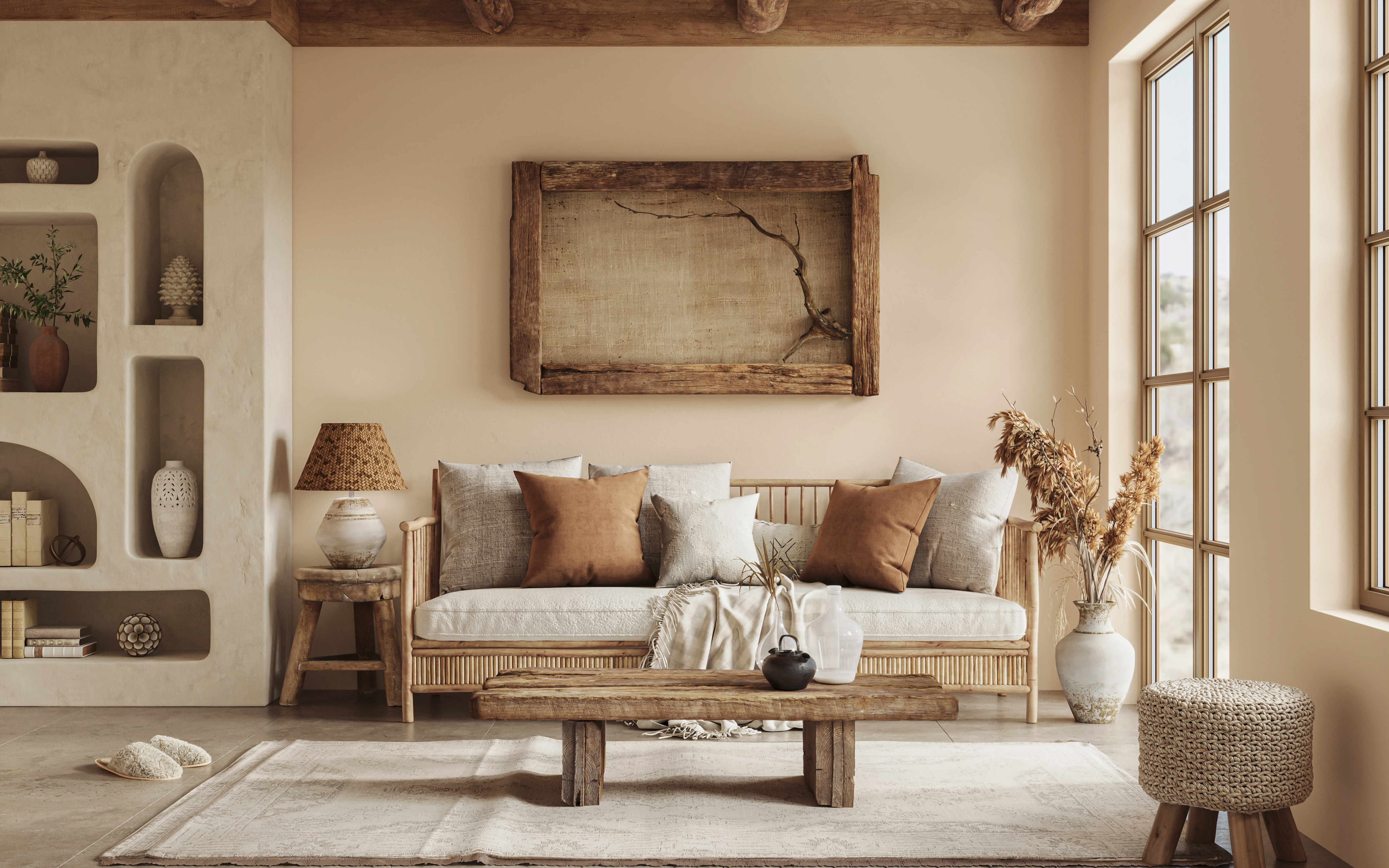• Choose organic, natural materials:  Using materials that are naturally occurring is central to this design style — think reclaimed wood, raw stone, handwoven textiles, and earthenware. Fabrics such as linen, cotton and hemp are great choices to use for upholstered pieces or window treatments, and while adding other furniture or decor made from unpolished wood, concrete and stone provides a balance to upholstery.
