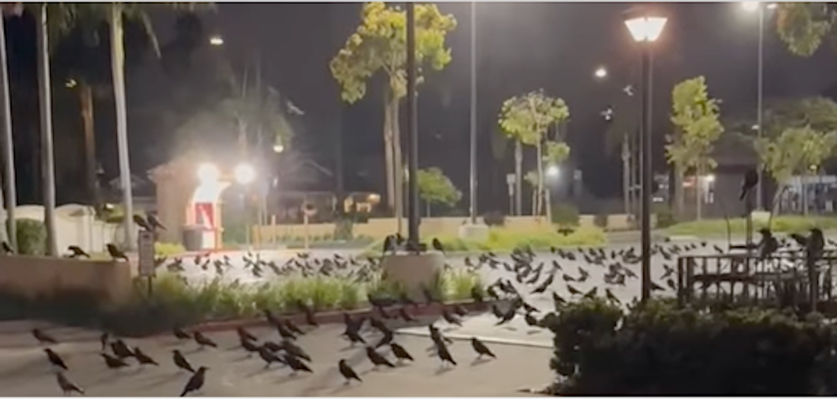 One video captured earlier this month shows a large gathering of crows in the Sprouts parking lot at nighttime, flocking on the asphalt illuminated by overhead lighting. It looks like a scene straight out of Alfred Hitchcock’s The Birds, with at least a hundred of them crowding up the lot.