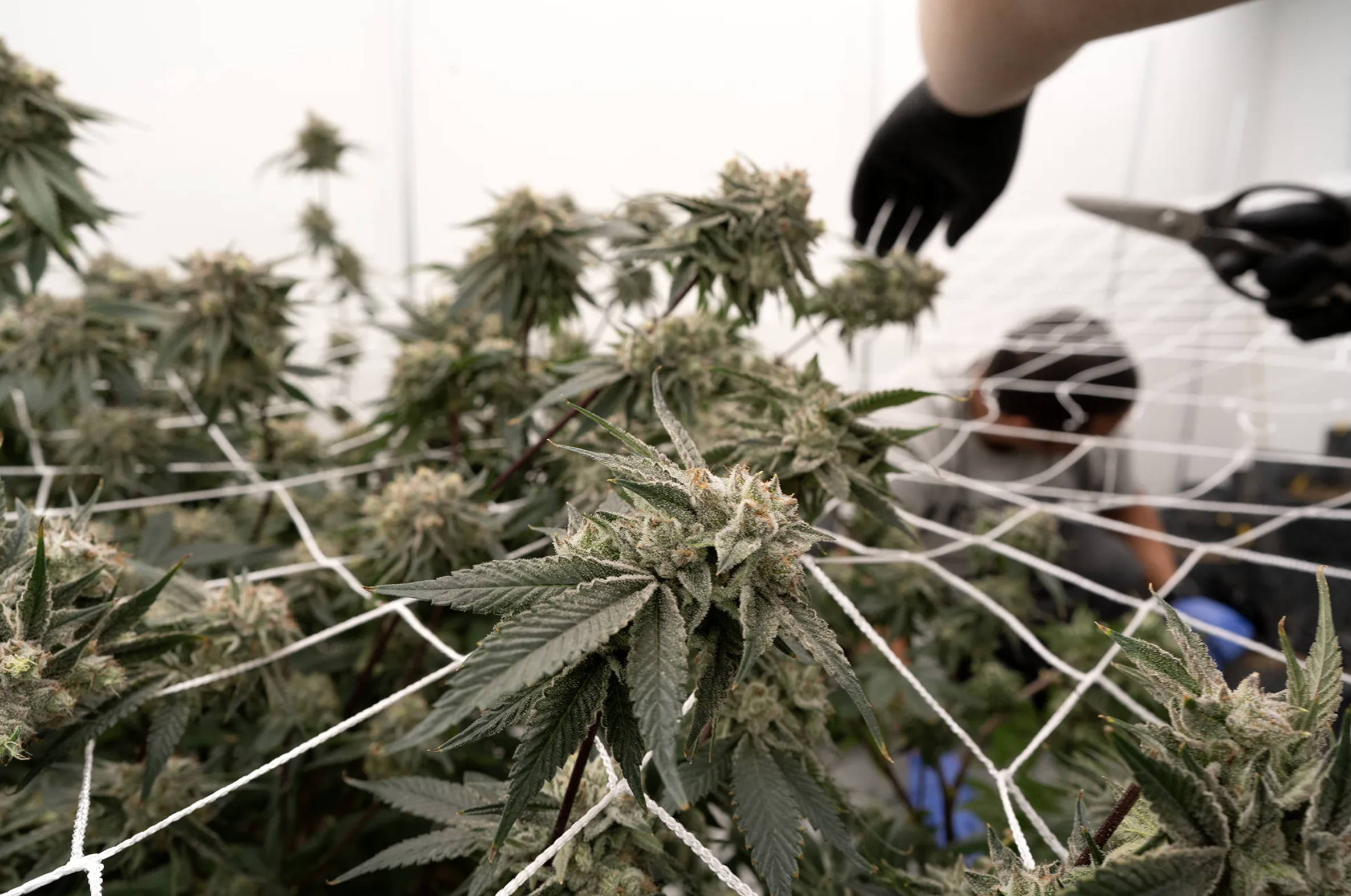 Workers harvest a fresh crop of marijuana at the Loving Kindness Farms in Los Angeles on May 8, 2020. | Credit: Richard Vogel, AP Photo