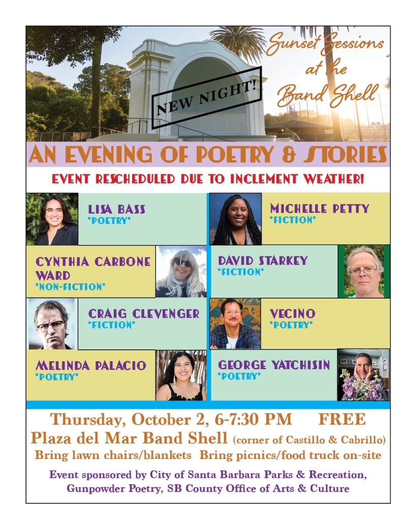 Sunset Sessions at the Band Shell: Poetry & Fiction. Featured readers include Lisa Bass, Cynthia Carbone Ward, Craig Clevenger, Melinda Palacio, Michelle Petty, David Starkey and Vecino, host/reader George Yatchisin, Plaza Del Mar Band Shell, corner of Castillo and Cabrillo sts., Santa Barbara, 6-8 p.m. (Rescheduled from October 18 rain out.)