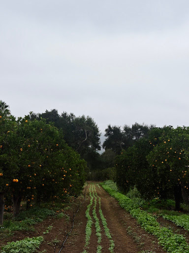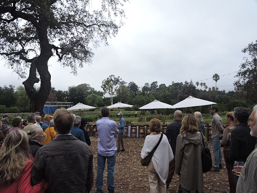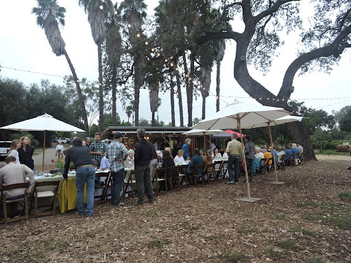 Eventually it was time to eat the multi-course, locally sourced dinner prepared by Chef William Robertson. Guests sat at a long table beneath string lights and an oak tree, which soon filled with farm salad, truffle risotto, and Ojai-chardonnay-braised chicken. Each plate was matched with wine from The Ojai Vineyard — a rosé to start, a crisp sauvignon blanc, then sangiovese with the entrée, and finally a riesling for dessert. The almond-coconut cake glazed with Amaro Angeleno, served with coconut whipped cream, closed the evening on a high note.