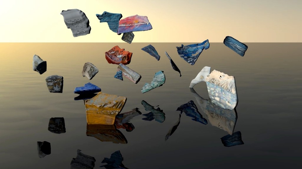 Ellis’s work is also environmentally themed. Titled “Left Behind,” with collaborative animation and sound design by Isabel Beavers, it features landscape drawings on discarded plastics collected near the North Pole. As the plastics float to the water’s surface like glaciers in the ocean, it asks the question, “What is left behind when the ice melts?” As Ellis wrote in her artist statement: “Human impact is reshaping our planet, affecting the farthest reaches of our planet. This work reflects on such impacts, gathering artifacts from the places we alter without noticing.”