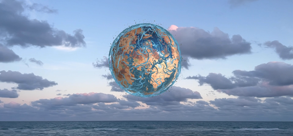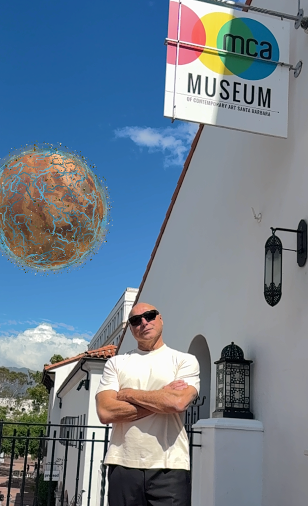 “Stone Speaks,” a special AR (Augmented Reality) installation by Baker Cahill, will be on view at the Welcoming Reception at MCASB’s Paseo Nuevo Arts Terrace on October 7. Inspired by conversations between Baker Cahill and Sophia the Robot about the accelerating climate crisis, and the adaptive potential of human-machine collaboration, “Stone Speaks” was originally geolocated simultaneously over Madinat Jumeirah in Dubai and Miami Beach in Florida, to underscore the borderless nature of the climate crisis.