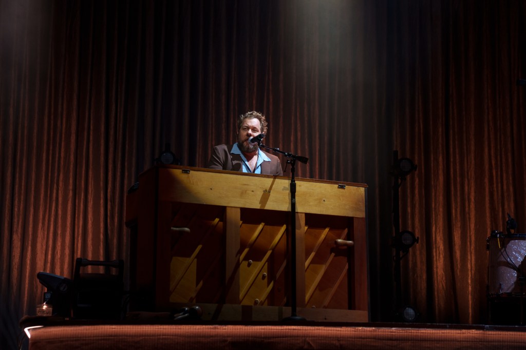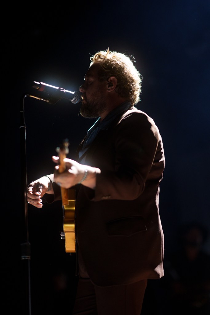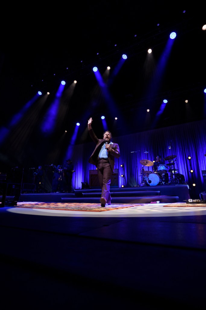 Dressed in a 60s-style, low-cut blue button-down under a brown suit with suspenders, he opened at the piano before moving to the mic, where his right-sided, smoky-twang of a voice filled the amphitheater. “Let’s take care of each other tonight,” he told the audience. The crowd responded in turn, clapping, stomping, even the folks in the seated rows couldn’t resist rising to their feet.