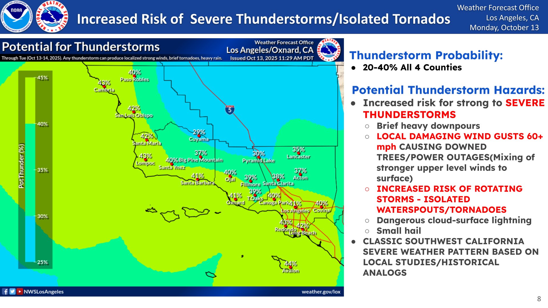 Thunderstorms, high winds, and even tornadoes are possible, given the atmospheric lows, wind divergence, and high shears aloft overnight. Debris flows, rockslides, a potential for flooded roads and highways, and heavy traffic during the Tuesday morning commute are all part of the forecast that predicts from 0.75 to 4 inches of rain in parts of Santa Barbara, Ventura, and Los Angeles counties.