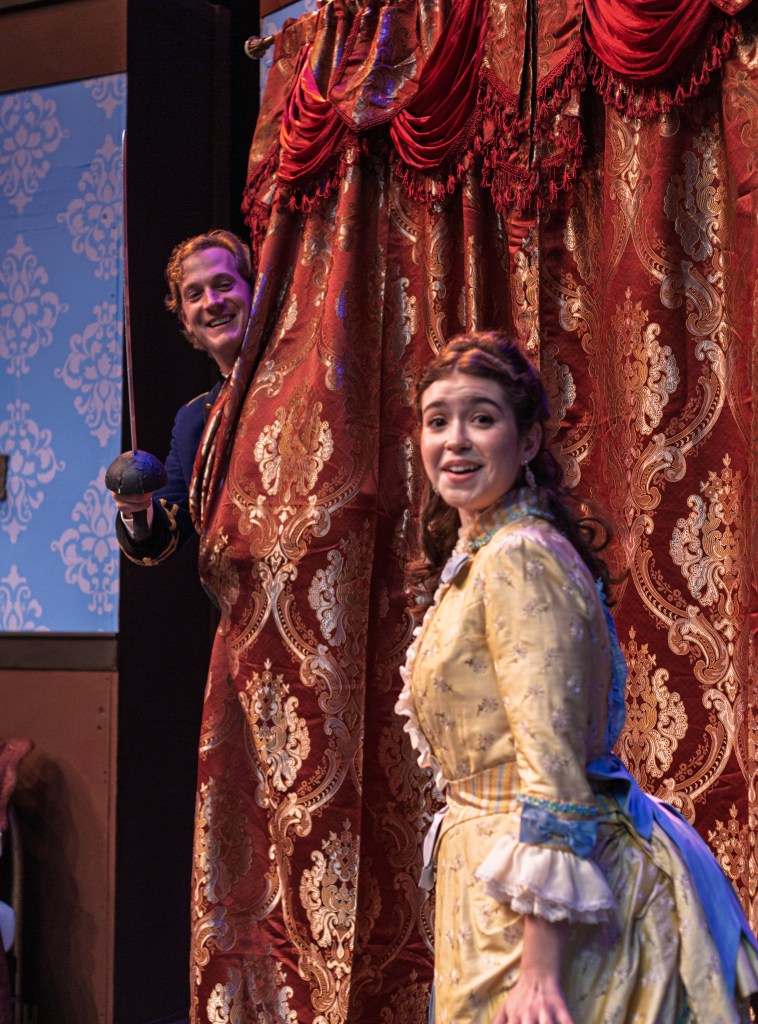 The story is full of potential — a Swiss mercenary (Clayton Barry) fighting for the Serbian army escapes chase from Bulgarian soldiers by climbing a drainpipe and hiding in the bedchamber of young socialite, Raina Petkoff (Charlotte Hecker). Scandalized and titillated by the situation, Raina aids the enemy combatant, only to be discovered when the war ends and the same man, now called Captain Bluntschli, shows up to pal around with Raina’s father (Major Petkoff, played by Matthew Tavianini) and her fiancé (Major Saranoff, played by Nik Valinsky). Unfortunately, the pacing of the opening-night performance never quite hit a stride that was assertive enough to pop the comedic dialogue, and audiences face a languid, conversational journey.
