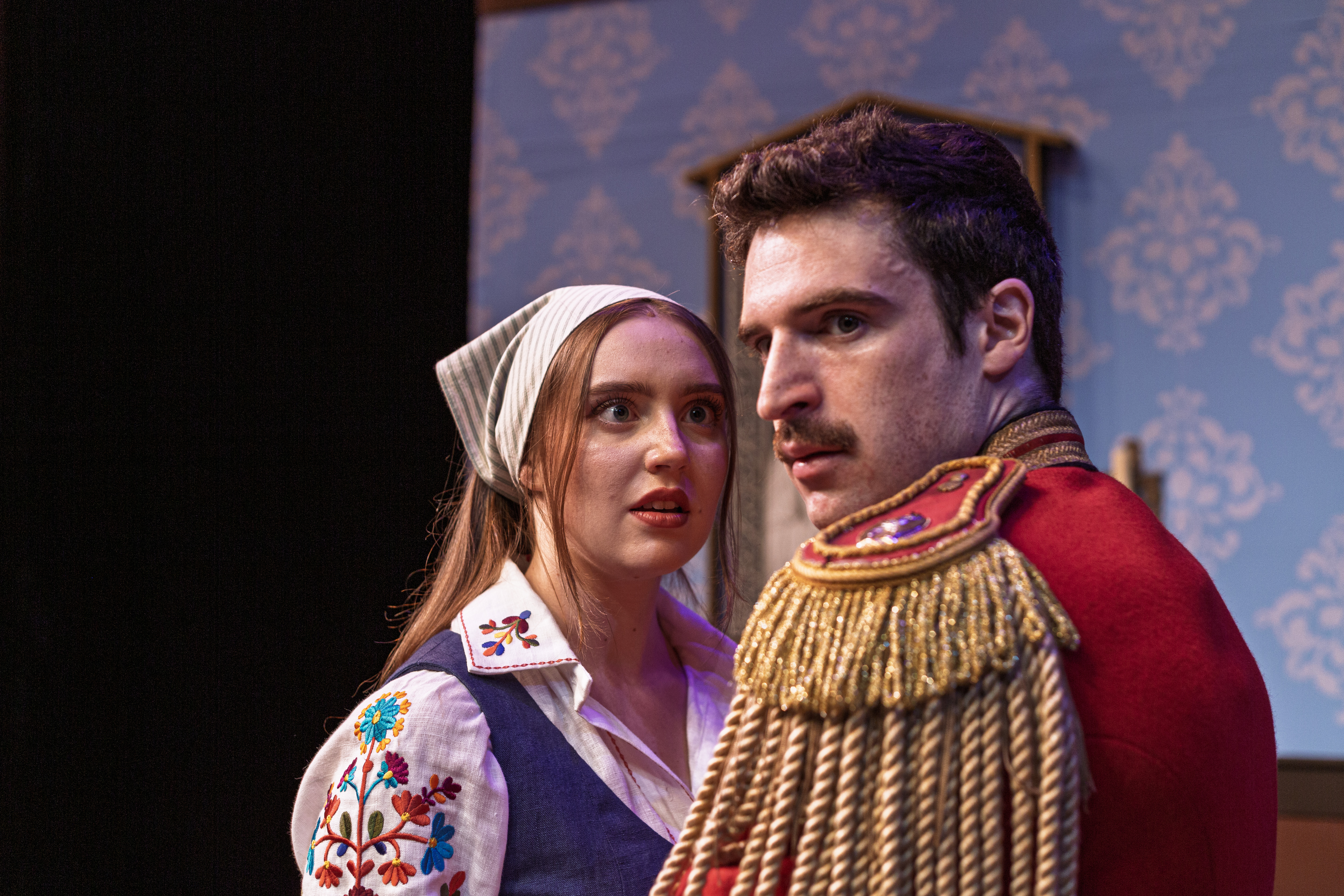 The story is full of potential — a Swiss mercenary (Clayton Barry) fighting for the Serbian army escapes chase from Bulgarian soldiers by climbing a drainpipe and hiding in the bedchamber of young socialite, Raina Petkoff (Charlotte Hecker). Scandalized and titillated by the situation, Raina aids the enemy combatant, only to be discovered when the war ends and the same man, now called Captain Bluntschli, shows up to pal around with Raina’s father (Major Petkoff, played by Matthew Tavianini) and her fiancé (Major Saranoff, played by Nik Valinsky). Unfortunately, the pacing of the opening-night performance never quite hit a stride that was assertive enough to pop the comedic dialogue, and audiences face a languid, conversational journey.