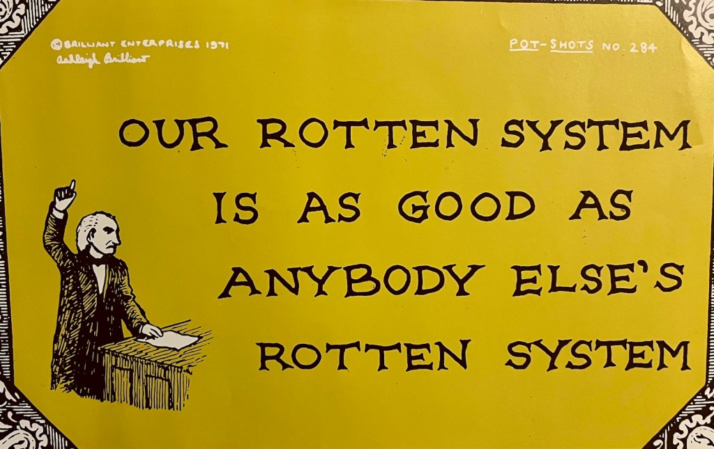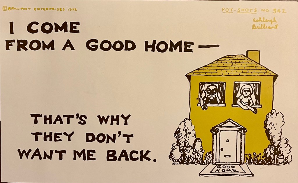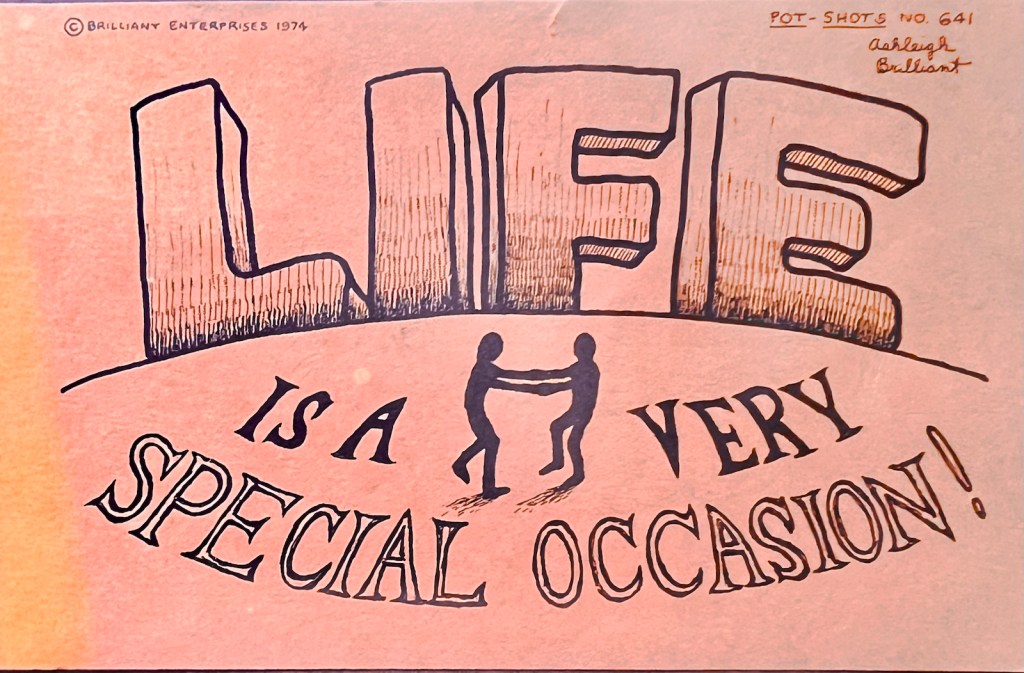 I first encountered Ashleigh Brilliant in an evening art class. He was handing out free postcard Pot-Shots to all the students. Recognizing him and his cards, I told him I had once sent him some ideas for his cards. He pulled out copies of his two rejection cards, and asked which one I had received. Mine said, “The answer is NO, but isn’t that better than no answer at all?”