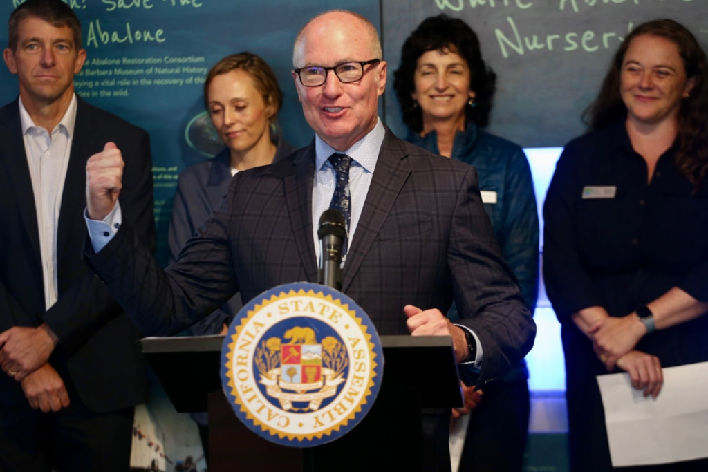 Hart and other community leaders in conservation celebrated AB 14’s passing at the Sea Center on Tuesday, backdropped by a giant replica of a barnacle-covered baleen whale hanging from the ceiling.