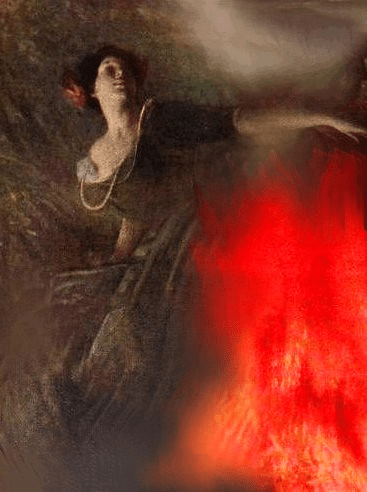 In the night following her death, Doña Inocencia was laid in the castle tower where priests led the gathered friends and family in prayer. A storm was raging outside, and a sudden gust of wind “swept wildly through the room” setting the drapery ablaze. A white figure, with floating hair and uplifted hands, appeared off in the black distance, and everyone fled the tower.