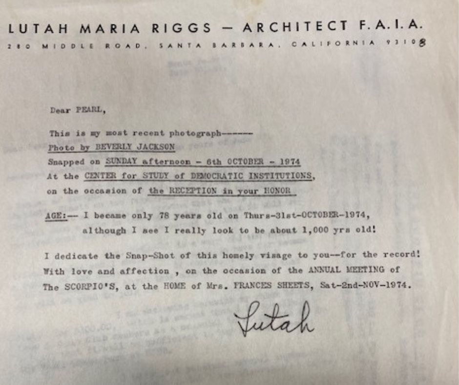 When submission of a photograph was required in 1974, architect Lutah Maria Riggs, a member since 1946, submitted hers to Pearl with a note, “I became only 78 years old on Thursday October 31, although I see I really look to be about 1,000 years old! I dedicate the snapshot of this homely visage to you, for the record! With love and affection on the occasion of the annual meeting of the Scorpios!”