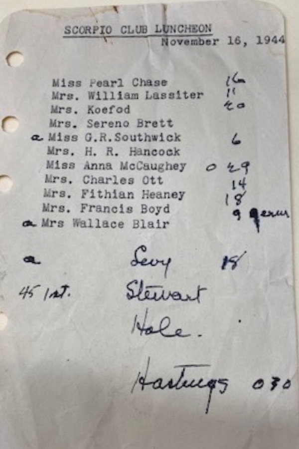 It came to her in November 1942 when her friend Edith Hancock, the first female city councilmember of Santa Barbara, was looking forward to celebrating her 46th birthday. Edith was dismayed, however, when her physician husband was called out of town, and she lamented the fact she would be alone on her special day. When Pearl got wind of her friend’s disappointment, she invited Edith to lunch to celebrate their mutual birthdays. She surprised her by inviting several other prominent women who also were born under the sign of Scorpio.