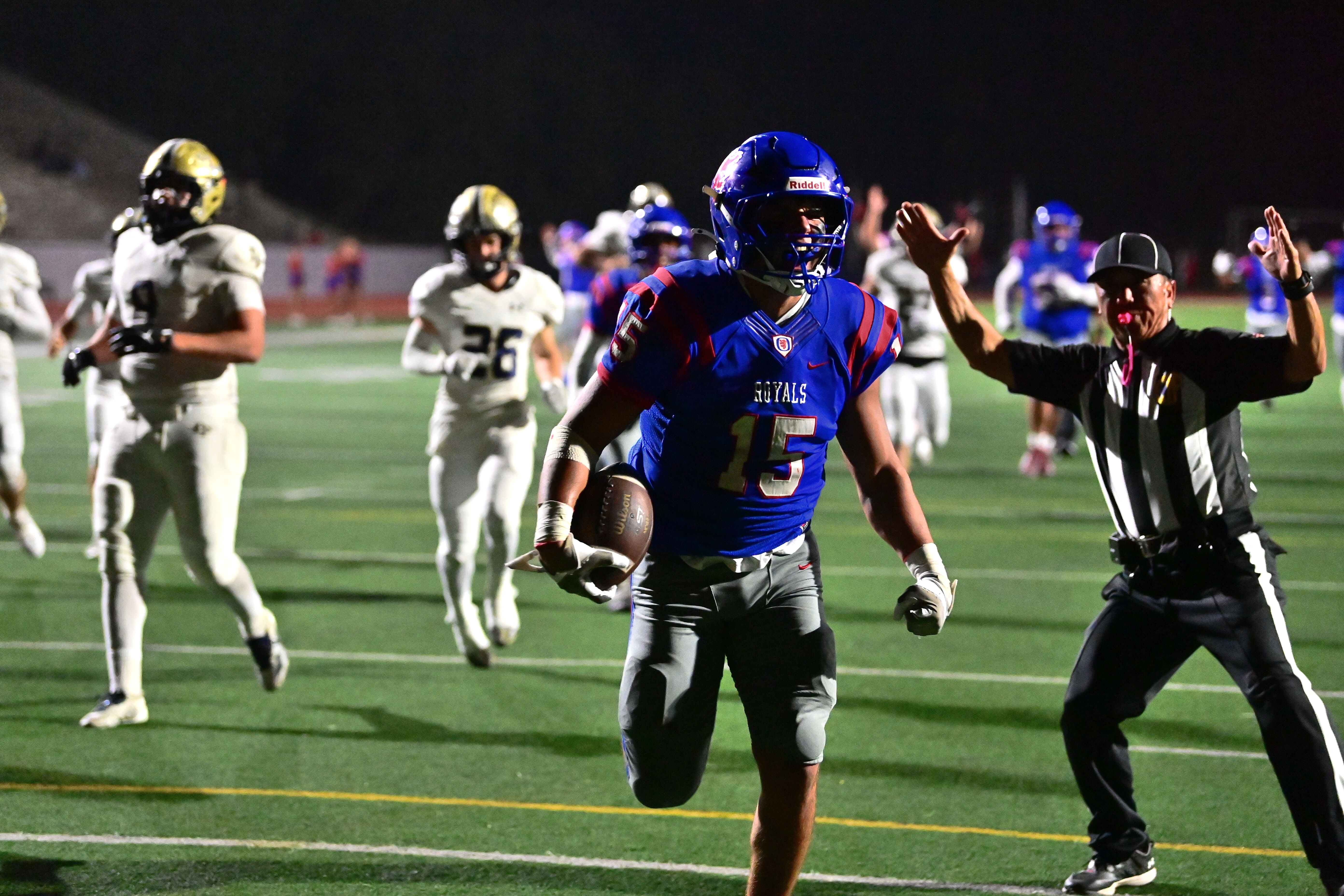 Logan Hale exploded into the backfield for a strip sack, and Cole Dominguez scooped up the ball and returned it 75 yards for a touchdown on the final play of the game. The Royals dogpiled in the end zone to celebrate their 16-10 victory over rival Dos Pueblos.