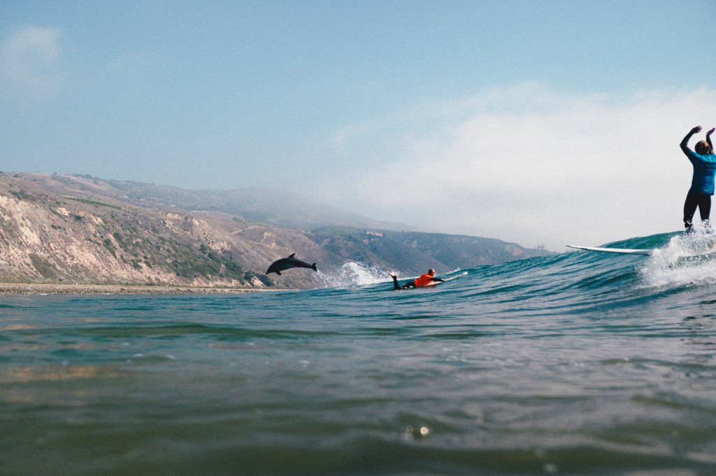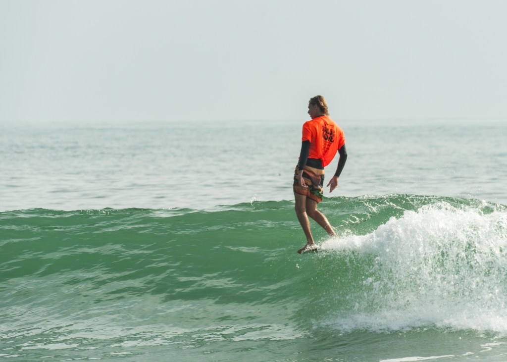 Local talent was not the only highlight of the day. Dolphins passed through the lineup, sharing a set wave with Timmy Davis in the early afternoon. But, while the dolphins were a sight to see, Reina riding her dad’s rainbow board was equally as heartwarming. “That’s the highlight. My daughter,” Turtle said, glancing over to her. “And the dolphins that just smoked through.”
