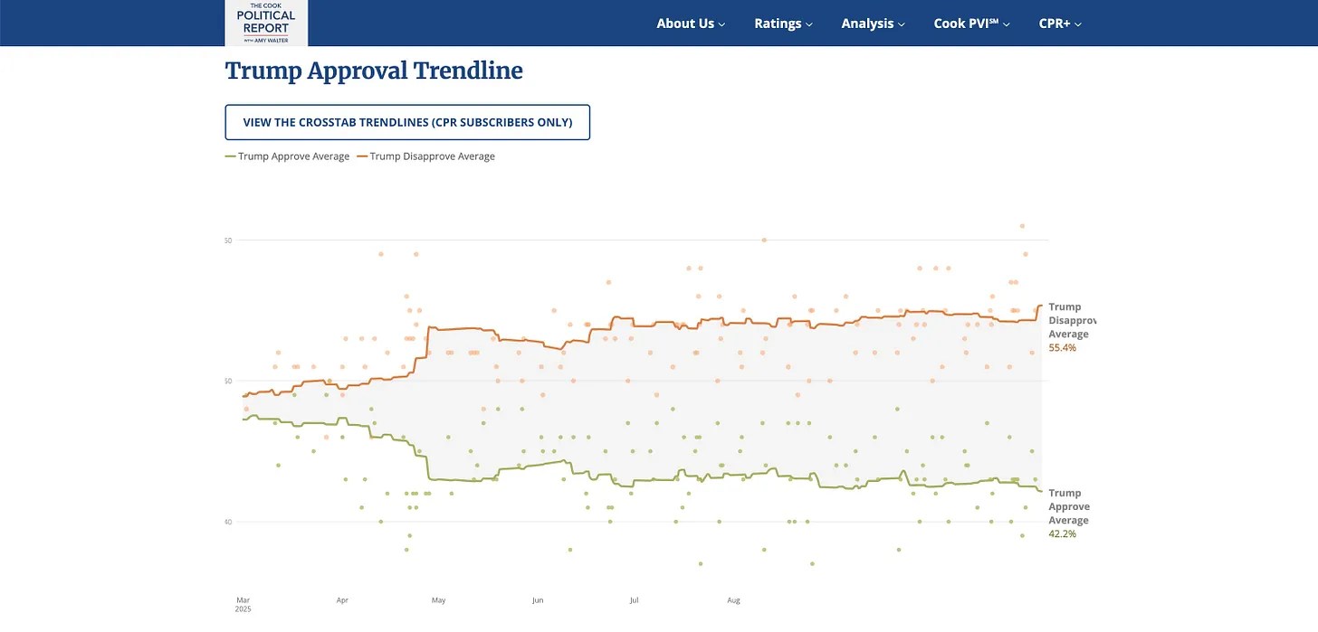 * Where Trump stands today. Here is the latest polling aggregation about Donald Trump from the Cook Political Report, which tracks public opinion of the president based on combining 21 high-quality surveys.
