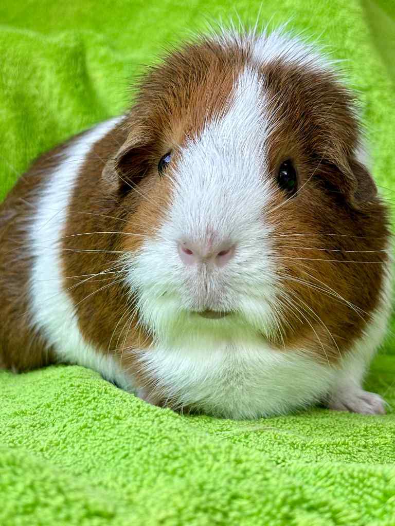 This lovely lady is a curvaceous American breed guinea-pig. She sports a fashionable crest and graceful ears that match her fur, but Macaroon has more to offer than just her good looks. She loves a warm lap to lounge in and greens for refreshment are her favorite thing. A bit of carrot to top it off and you will have the most contented (guinea) pig-in-a-blanket as your best friend!
