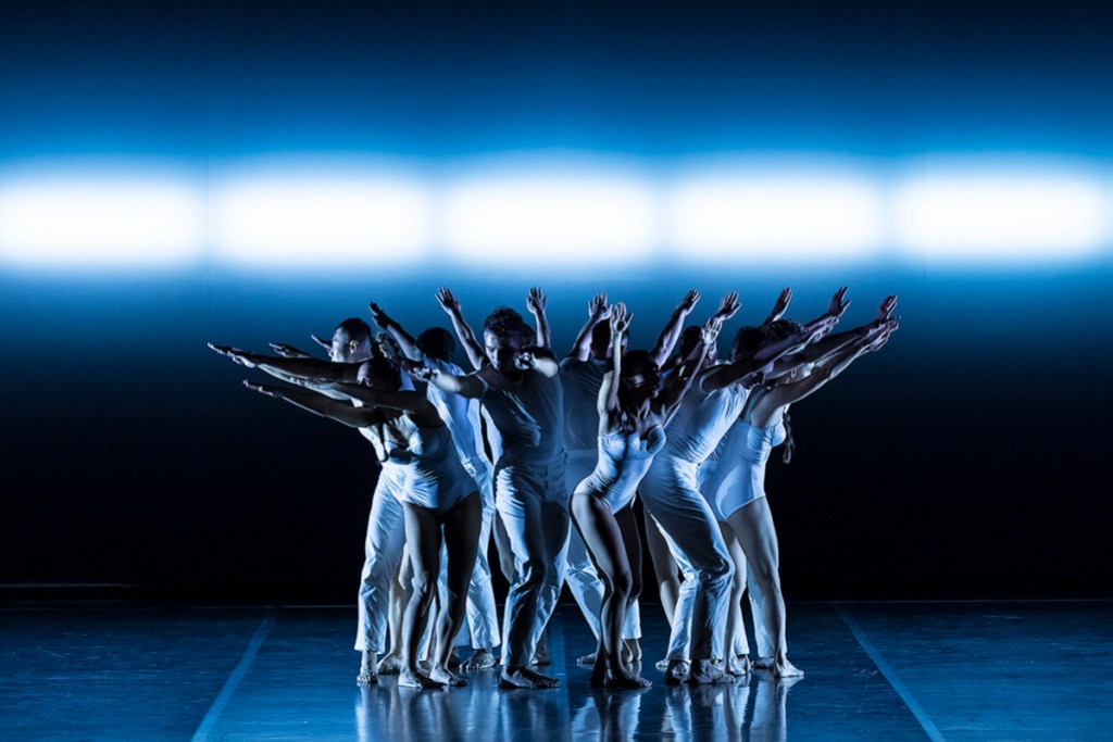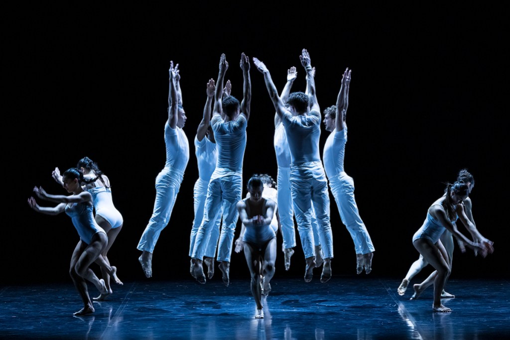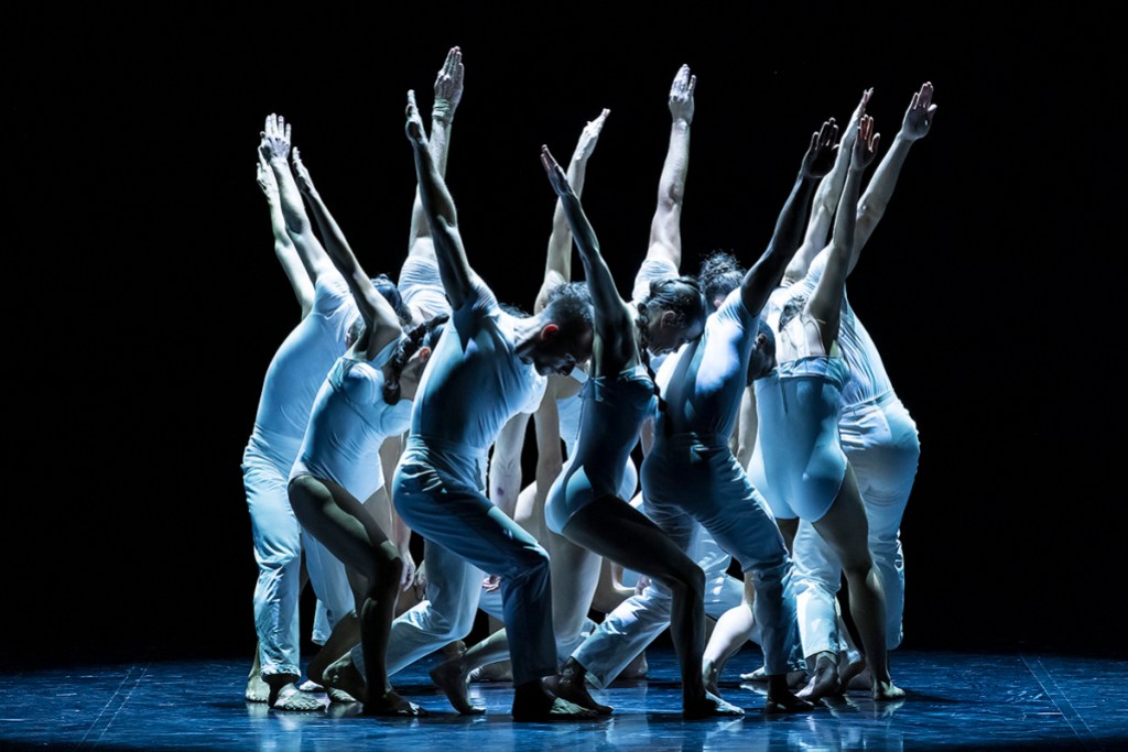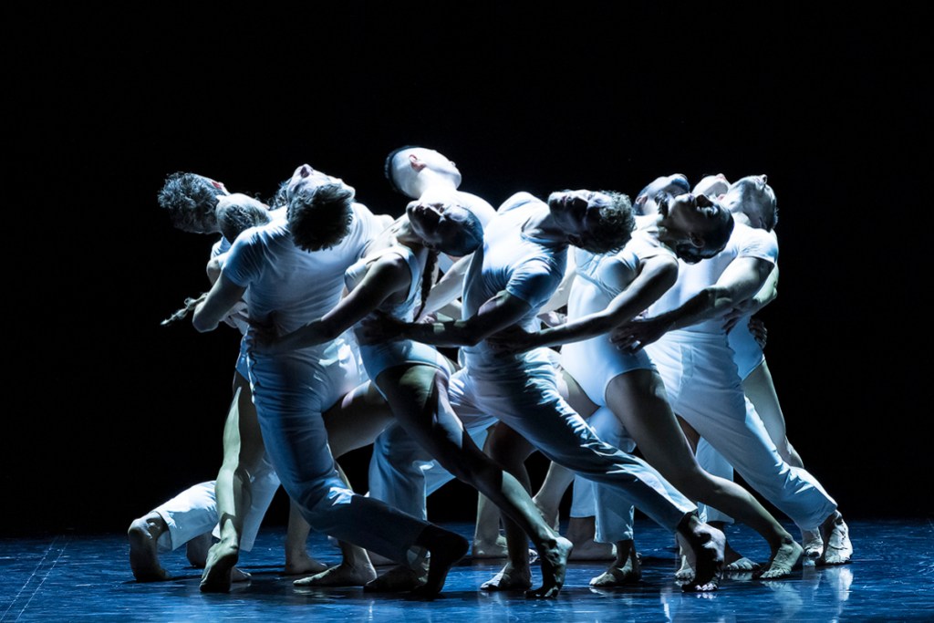 Starting with a puddle of bodies scattered on stage in near darkness, limbs gradually rise up from the pile and slowly form clusters until eventually all 12 dancers are upright and visible with a dawning stage light, set to the sound of cicadas chirping. Gravity, choreographed by Angelin Preljocaj in 2018, opens like a birth, as dancers explore the physical ideas of weight, speed, and pathways through space.