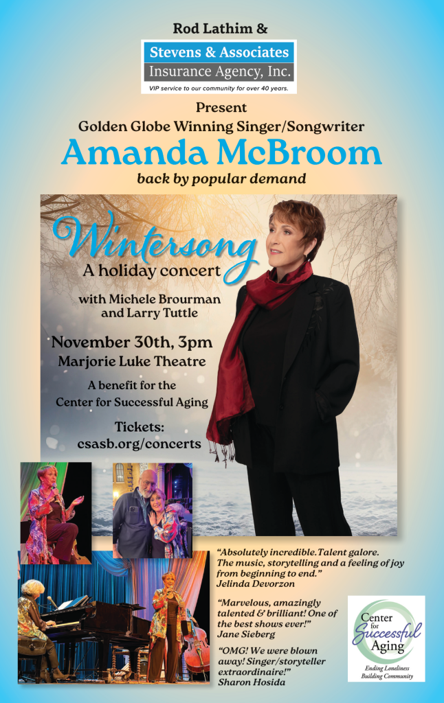 Amanda McBroom performs Wintersong Sunday, November 30, 3 p.m., at the Marjorie Luke Theatre (721 E. Cota St.). Free off-street parking, wheelchair access, and Assistive Listening Loop System are all available. For tickets, see csasb.org/concerts.