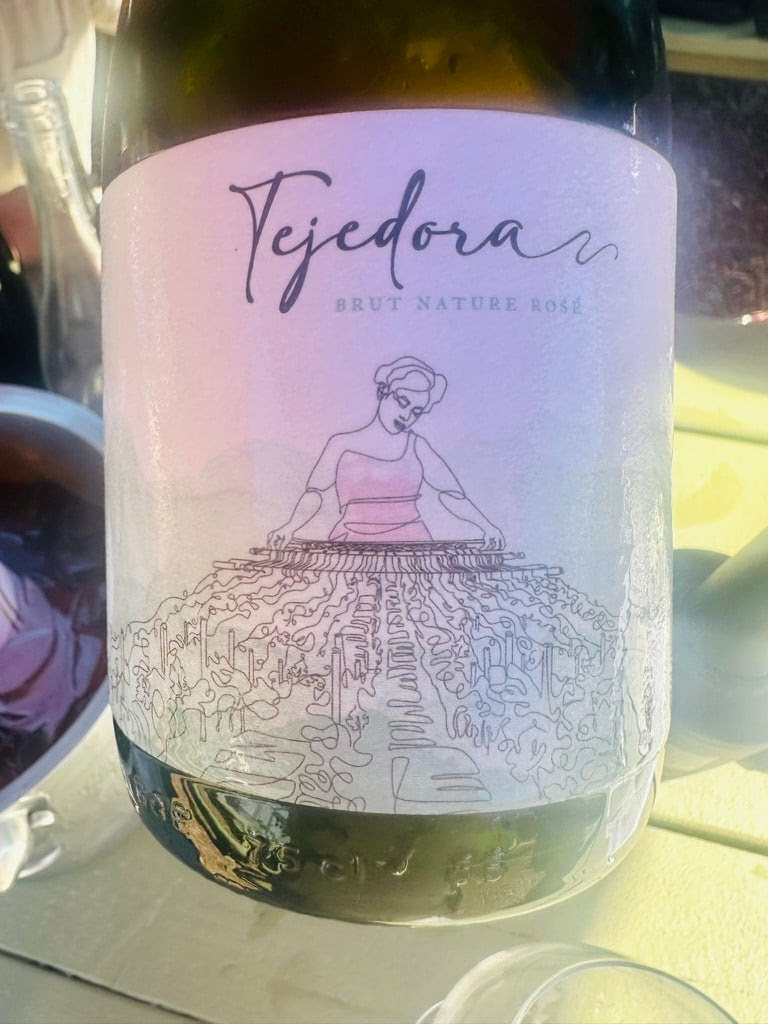 That deeply hued Italian red variety was the base of our first wine of the day: a sparkling aglianico called “Tejedora” that was certainly the first sparkling aglianico I’ve ever seen — zesty, lightly plummy, a brilliantly transparent magenta color. Its bottle features a woman weaving a shroud, which is a nod to the Penelope of Odyssey fame, and to Verónica’s middle name.