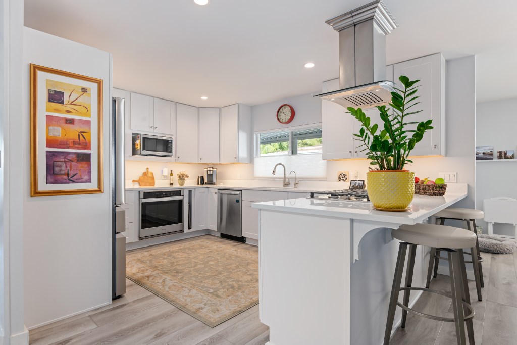 There are also plenty of details that you CAN see. The remodeled kitchen gleams with shaker cabinets, quartz countertops, and new stainless-steel appliances. Every inch has been refreshed — new flooring, cabinetry, fixtures, window coverings, and all new doors inside and out.