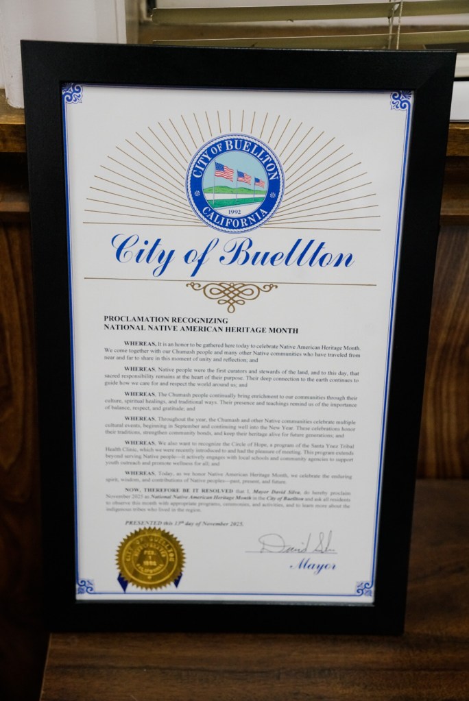 Native American Heritage Month is observed each November to honor the history, culture and contributions of Native peoples. Buellton’s proclamation reflects its commitment to fostering inclusivity and cultural awareness within the community.